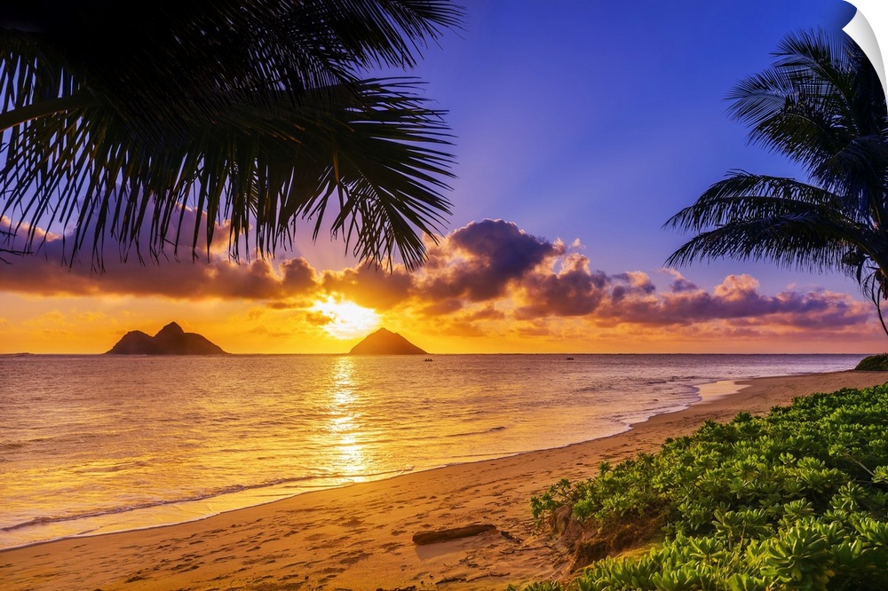 <p>Sunrise viewed from Lanikai Beach with a view of the Mokulua Islands off the coast; Oahu, Hawaii, United States of America.</p>