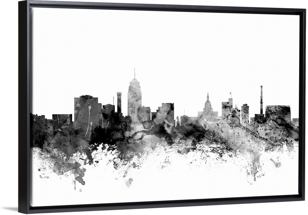 <p>Contemporary artwork of the Lansing city skyline in black watercolor paint splashes.</p>