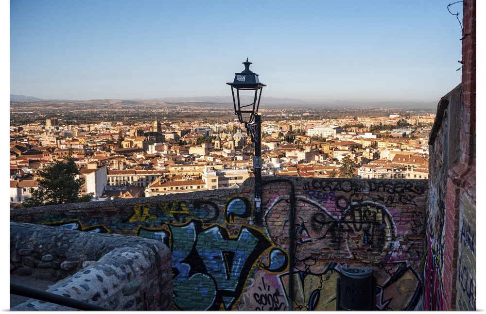<p>Lantern and street art walls in front of the skyline at sunrise, Granada, Andalusia, Spain</p>