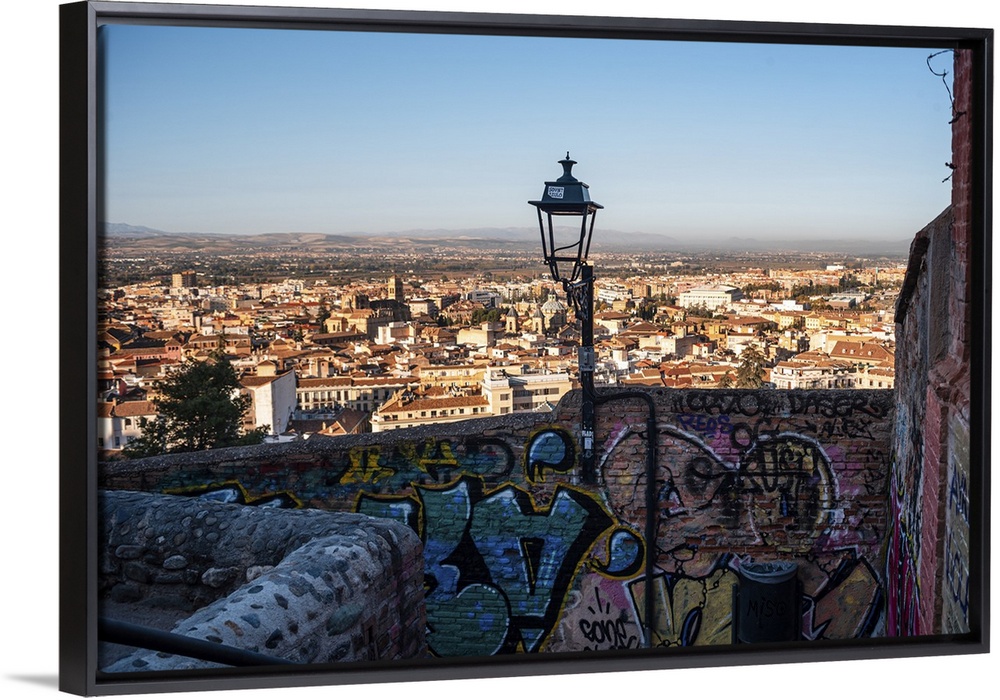 <p>Lantern and street art walls in front of the skyline at sunrise, Granada, Andalusia, Spain</p>