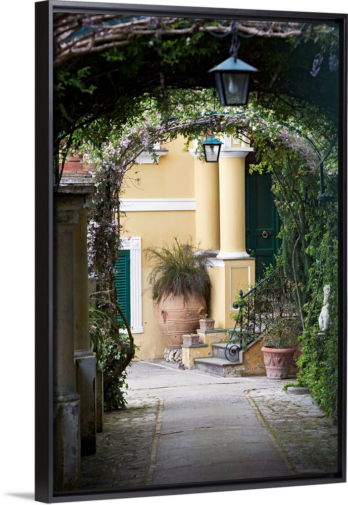<p>A vertical photograph or a walkway under vine covered arches in a scenic Italian city.</p>