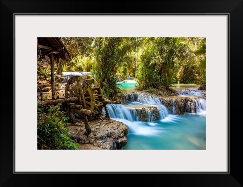 <p>Laos, North Region, Louangphrabang, Turquoise water of the Kuang Si Waterfall and old mill.</p>