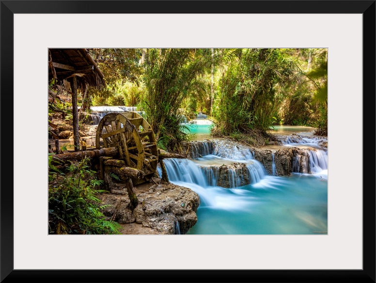 <p>Laos, North Region, Louangphrabang, Turquoise water of the Kuang Si Waterfall and old mill.</p>