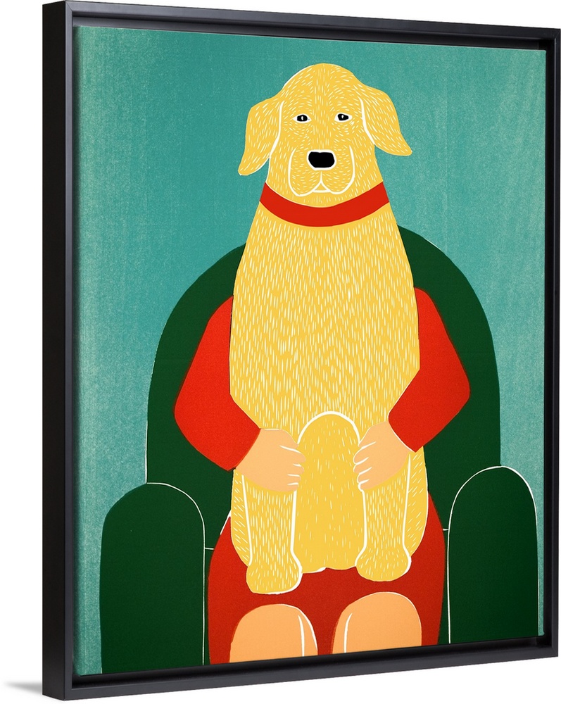 <p>Illustration of a yellow lab sitting on its owners lap on a green chair.</p>