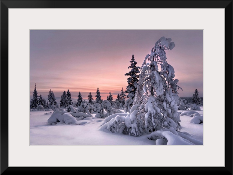 <p>Trees with branches bending under the weight of a heavy snowfall at sunset, Finland.</p>