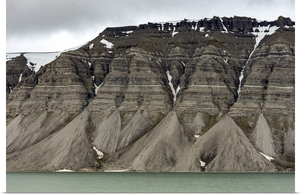 <p>Large alluvial fans along wall of Tempelfjorden, Spitsbergen, Svalbard, Arctic, Norway, Europe</p>