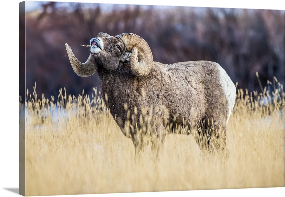 <p>Large Bighorn Sheep ram (Ovis canadensis) with massive horns performs lip curl (flehmen) display during the rut near Yellowstone National Park; Montana, United States of America.</p>