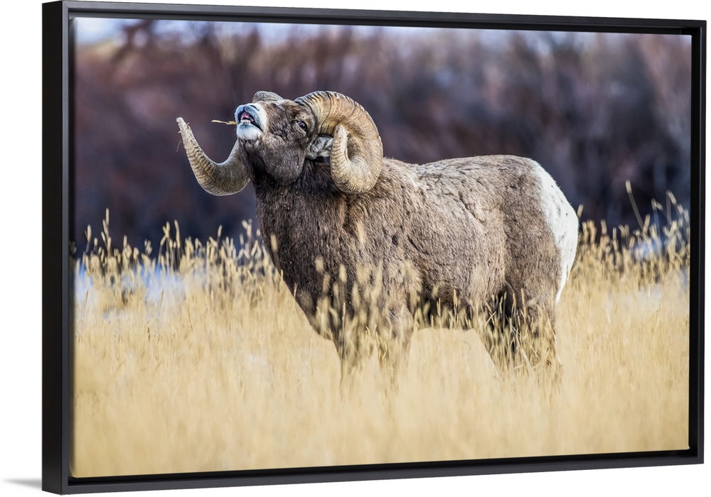 <p>Large Bighorn Sheep ram (Ovis canadensis) with massive horns performs lip curl (flehmen) display during the rut near Yellowstone National Park; Montana, United States of America.</p>