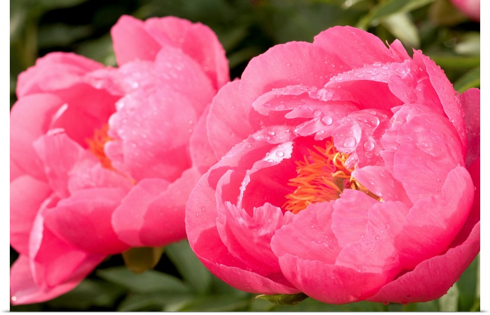 <p>Oversized, close up, landscape photograph from the National Geographic Collection of two large peony flowers with water droplets on the petals, one in sharper focus as it is closer to the foreground, on a background of softly focused greenery.</p>