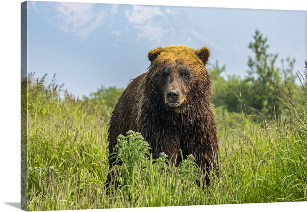 <p>Large brown bear boar (Ursus arctos) looking at camera, Alaska Wildlife Conservation Center, South-central Alaska; Portage, Alaska, United States of America</p>