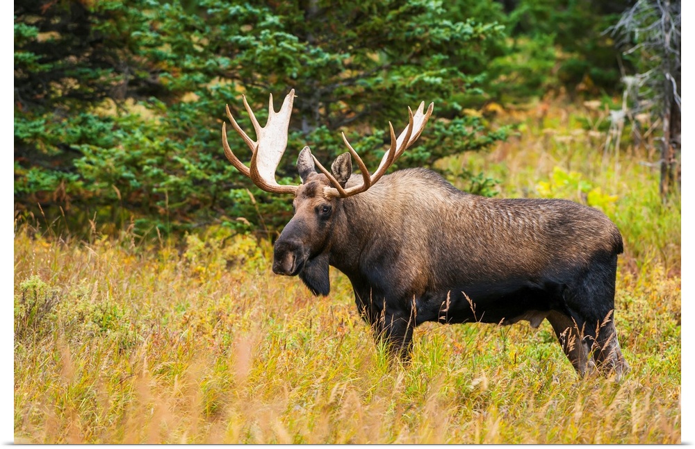 <p>Large bull moose in rut emerges from a stand of trees at Powerline Pass in the Chugach State Park, near Anchorage, Alaska.</p>