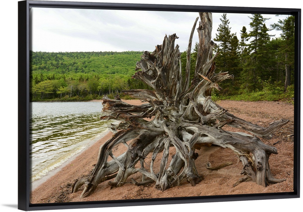 <p>Large driftwood tree on the Warren Lake beach, in Cape Breton Highlands National Park. Warren Lake Beach, Cape Breton Highlands National Park, Cape Breton, Nova Scotia, Canada.</p>