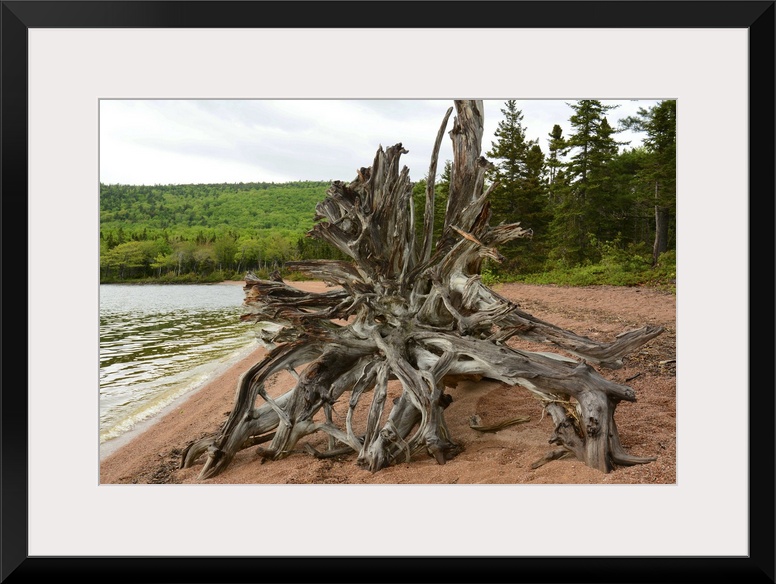<p>Large driftwood tree on the Warren Lake beach, in Cape Breton Highlands National Park. Warren Lake Beach, Cape Breton Highlands National Park, Cape Breton, Nova Scotia, Canada.</p>