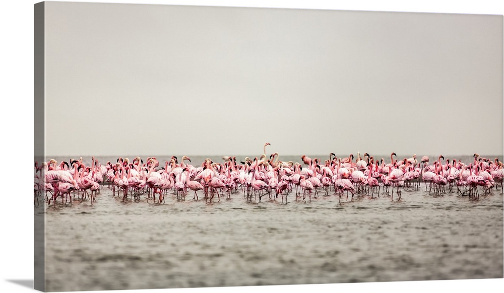 <p>A large flock of flamingos standing in the shallow water of Walvis Bay; Sossusvlei, Hardap Region, Namibia</p>