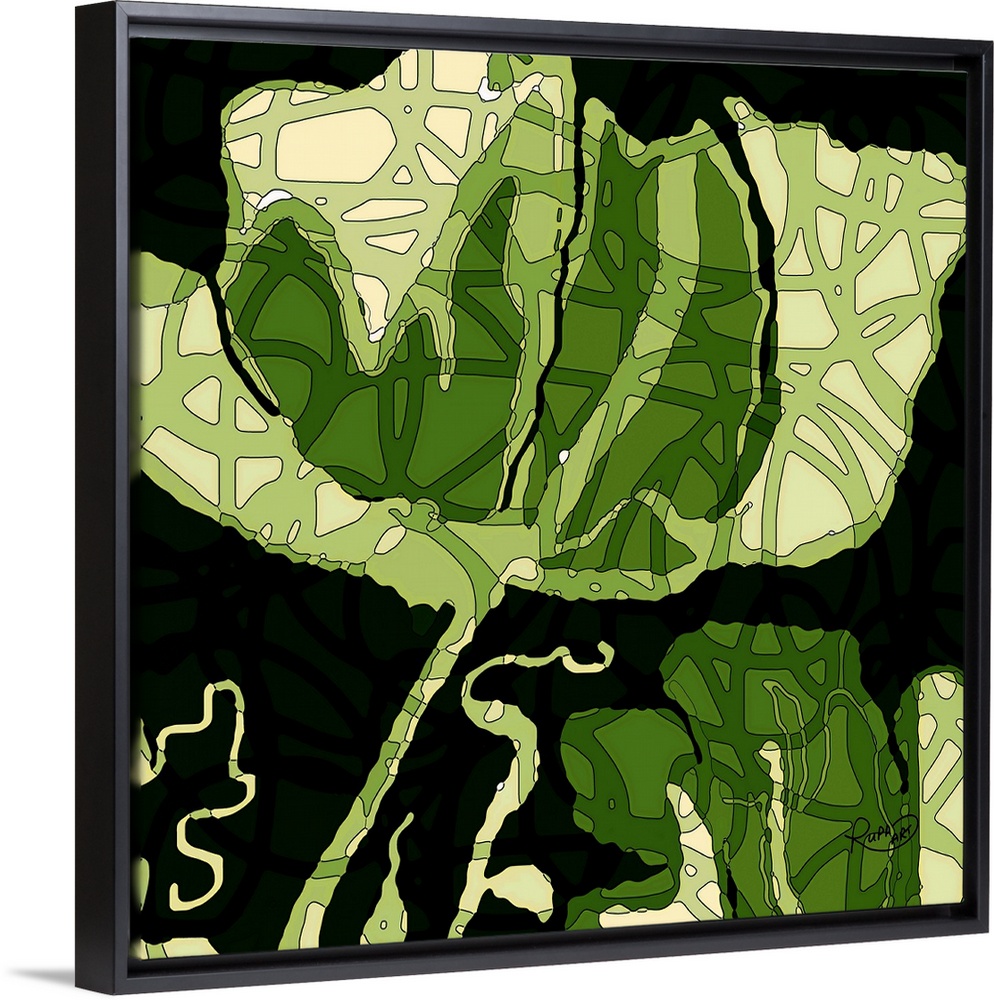 <p>Square abstract art of a large green flower with a lined design on top on a black background.</p>