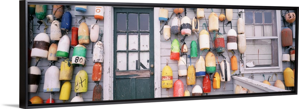 <p>Various colored and styled buoys hang on the side of a shack with a run down door in between.</p>