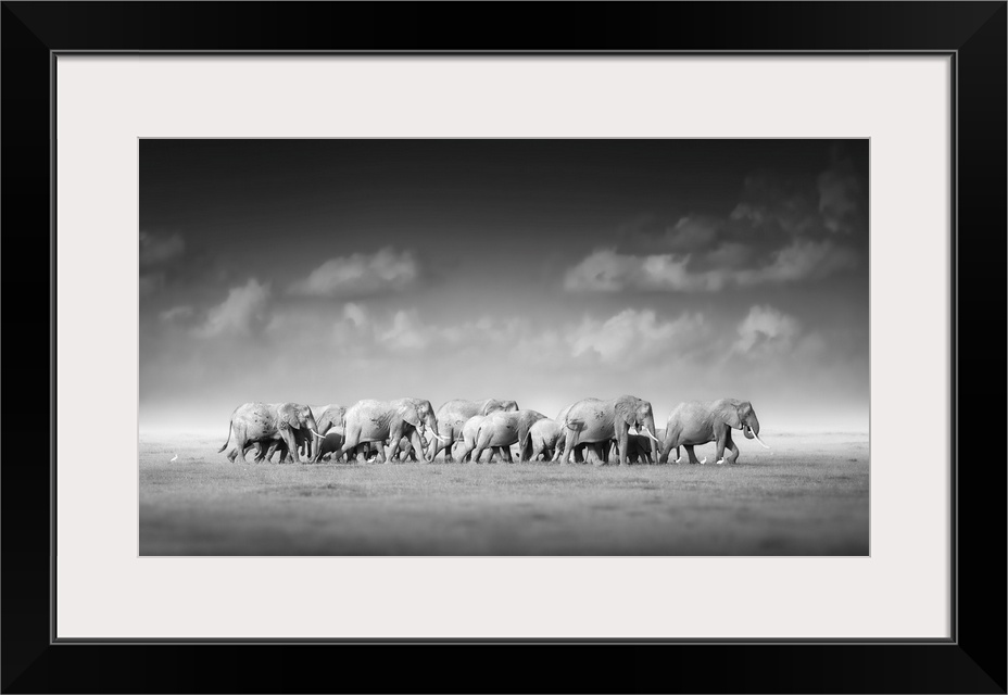 <p>Artistic, black and white photo of large herd of African elephants, Loxodonta Africana, from adults to newborn calf against dark background, savanna, low angle photo. Amboseli national park, Kenya.</p>