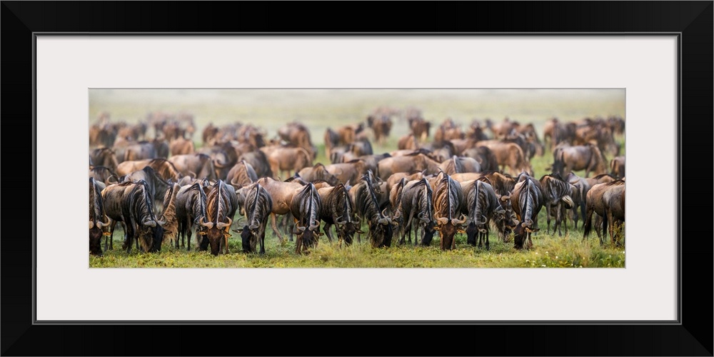 <p>Large herd of western white-bearded wildebeest (Connochaetes taurinus mearnsi), Ngorongoro Conservation Area, Tanzania</p>