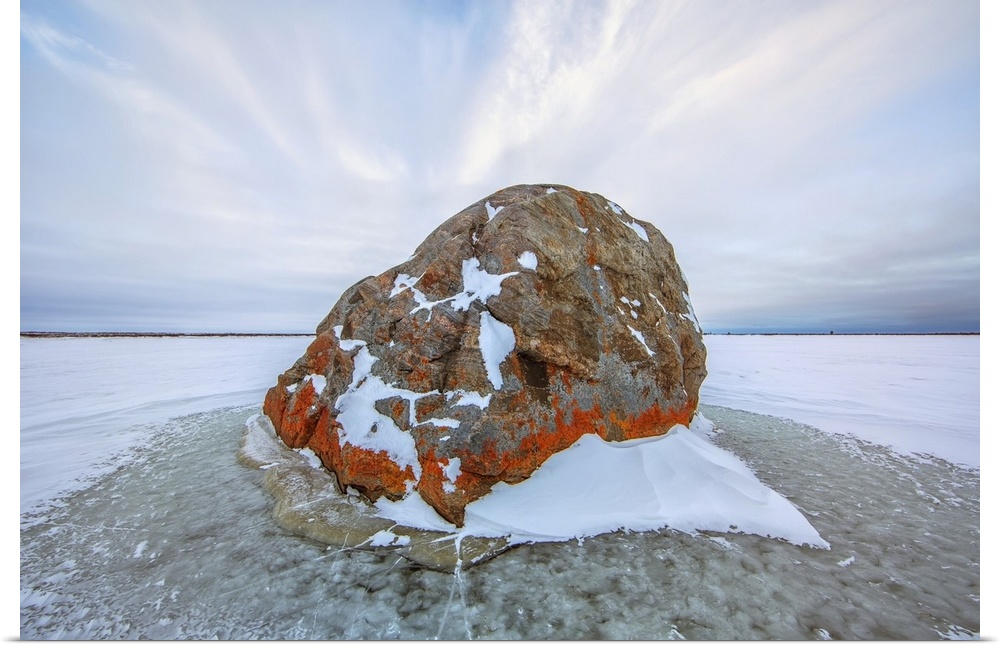 <p>Large lichen covered rock in a frozen lake situated on the flats beside hudson's bay, Manitoba, Canada</p>