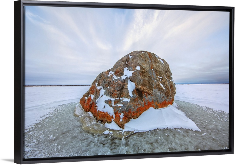 <p>Large lichen covered rock in a frozen lake situated on the flats beside hudson's bay, Manitoba, Canada</p>