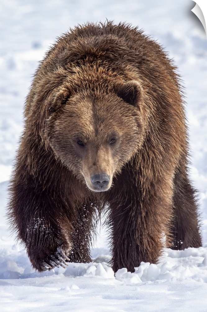 <p>Large male brown bear (ursus arctos) walks towards camera in snow, captive at Alaska wildlife conservation center, south-central Alaska, Alaska, united states of America.</p>