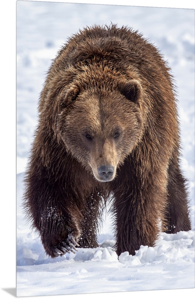<p>Large male brown bear (ursus arctos) walks towards camera in snow, captive at Alaska wildlife conservation center, south-central Alaska, Alaska, united states of America.</p>