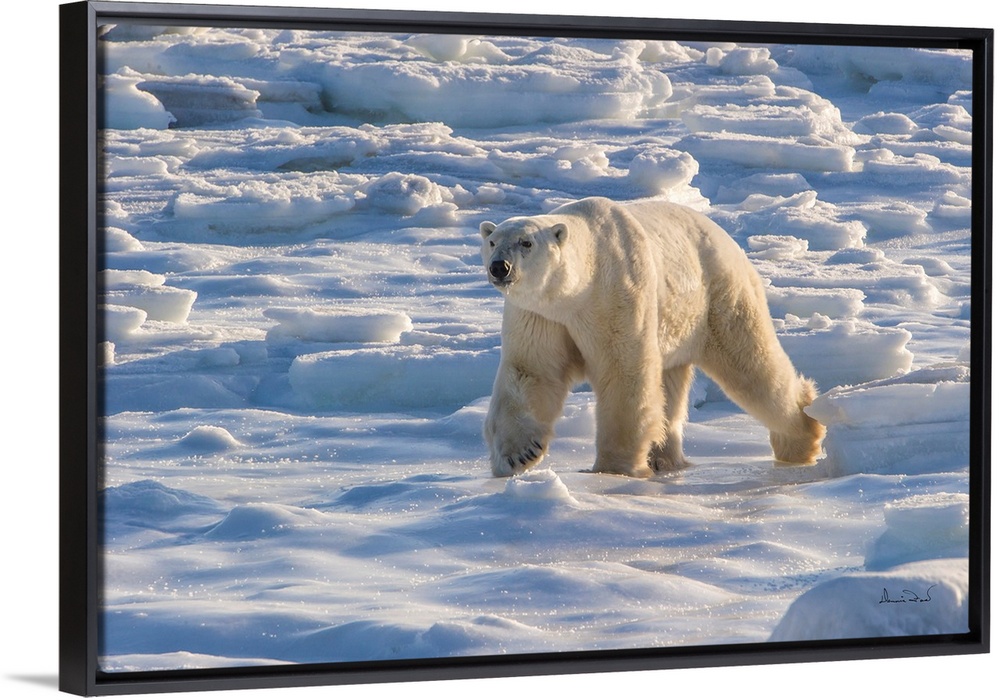 <p>Mature polar bear (Ursus maritimus) near the Hudson Bay Coast, Manitoba, Canada, approaching in a fresh sea ice setting.</p>
