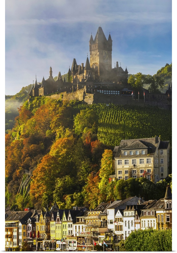 <p>Large medieval castle on top of a colorful treed hillside with fog, blue sky, cloud, and village below, Cochem, Germany.</p>