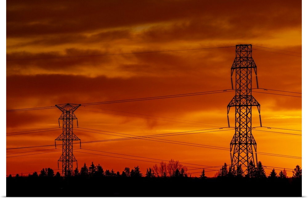 <p>Silhouette of large metal electrical towers with a colorful dramatic sky in the background, Calgary, Alberta, Canada.</p>