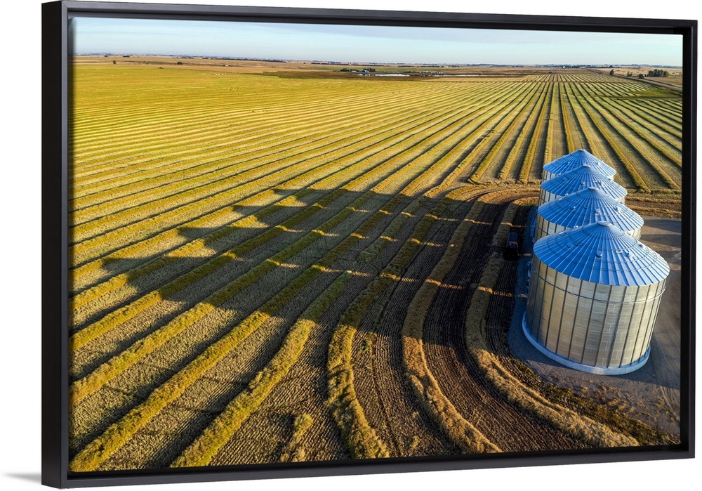 <p>Aerial view of four large metal grain bins and canola harvest lines at sunset with long shadows; Alberta, Canada</p>