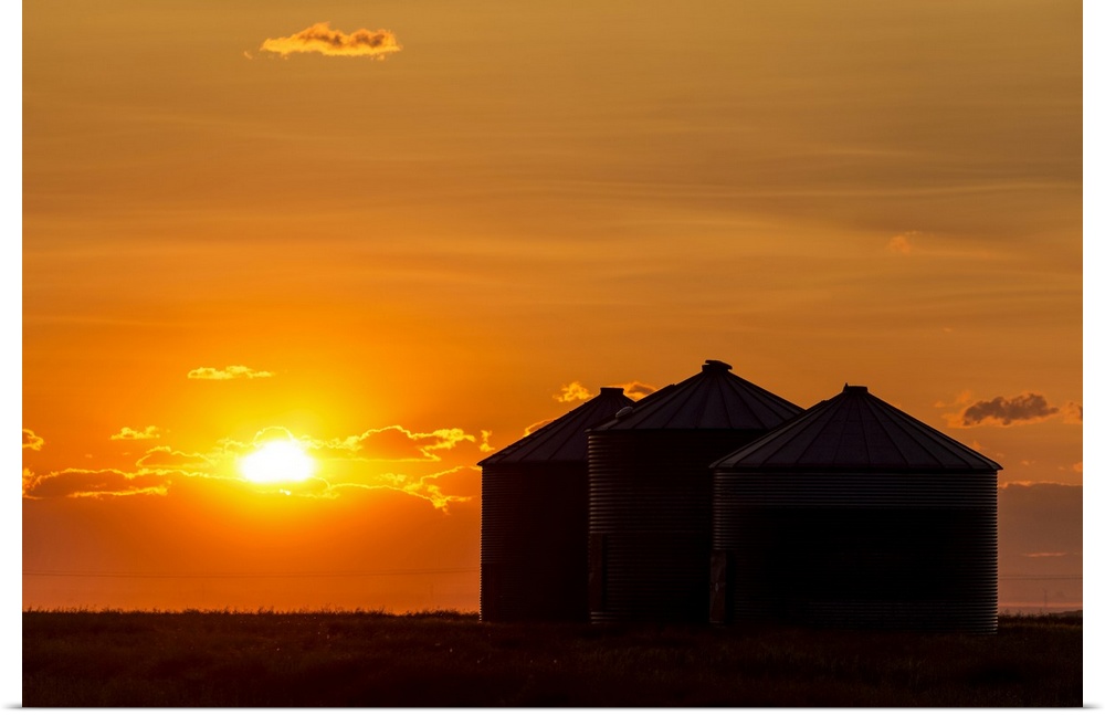 <p>Silhouette of large metal grain bins at sunrise with orange sun rising over clouds; Alberta, Canada</p>