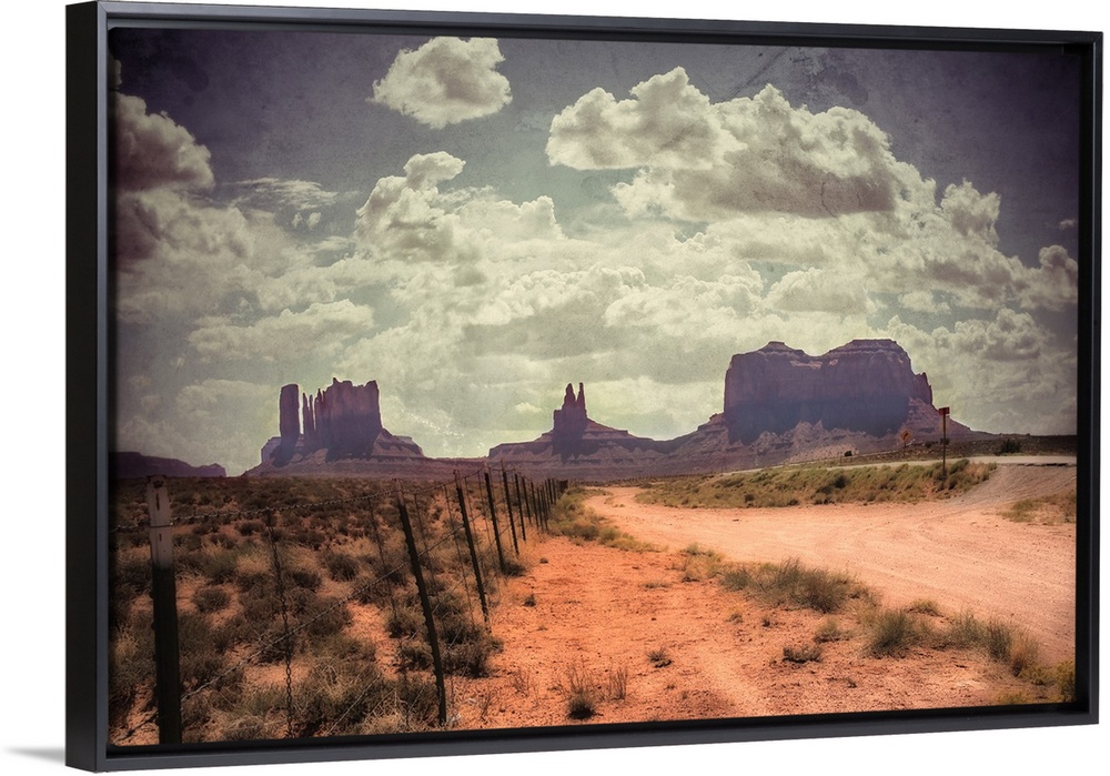 <p>Large monolithic rocks in the background looking through Monument Valley in the United States, with desertic road and clouds in a blue summer sky with a level of texture</p>