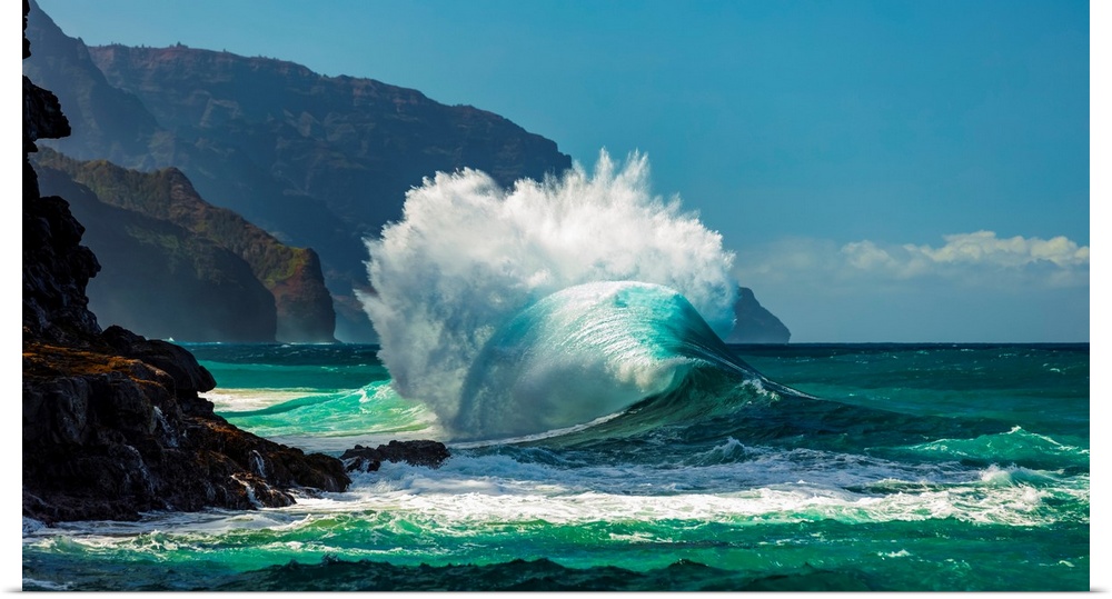<p>Large ocean wave crashes into rock along the Na Pali coast, Kauai, Hawaii, united states of America.</p>
