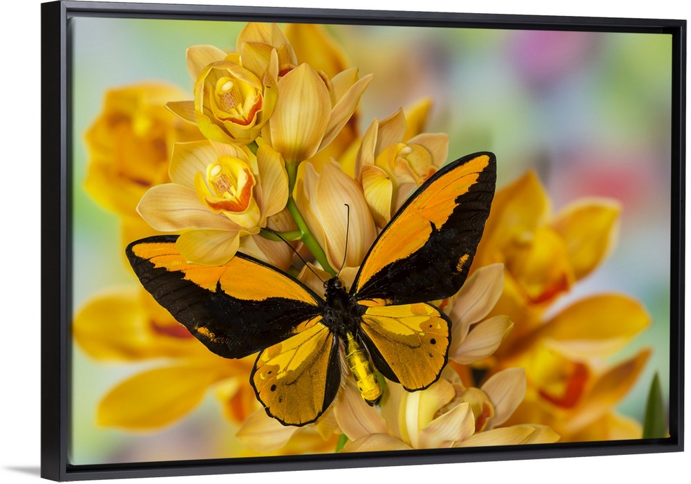 <p>Large orange birdwing, Ornithoptera croesus, butterfly on large golden cymbidium orchid</p>