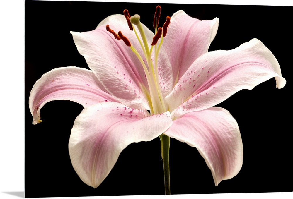 <p>Large pink lily flower with black background.</p>