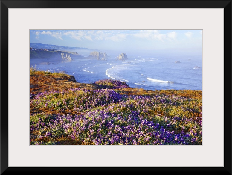 <p>21 Jun 2011, Bandon, Oregon, USA --- Morning light adds beauty to wildflowers and fog covered rock formations at Bandon State Park, Oregon Coast, Pacific Ocean, Pacific Northwest. --- Image by Craig Tuttle/Corbis</p>