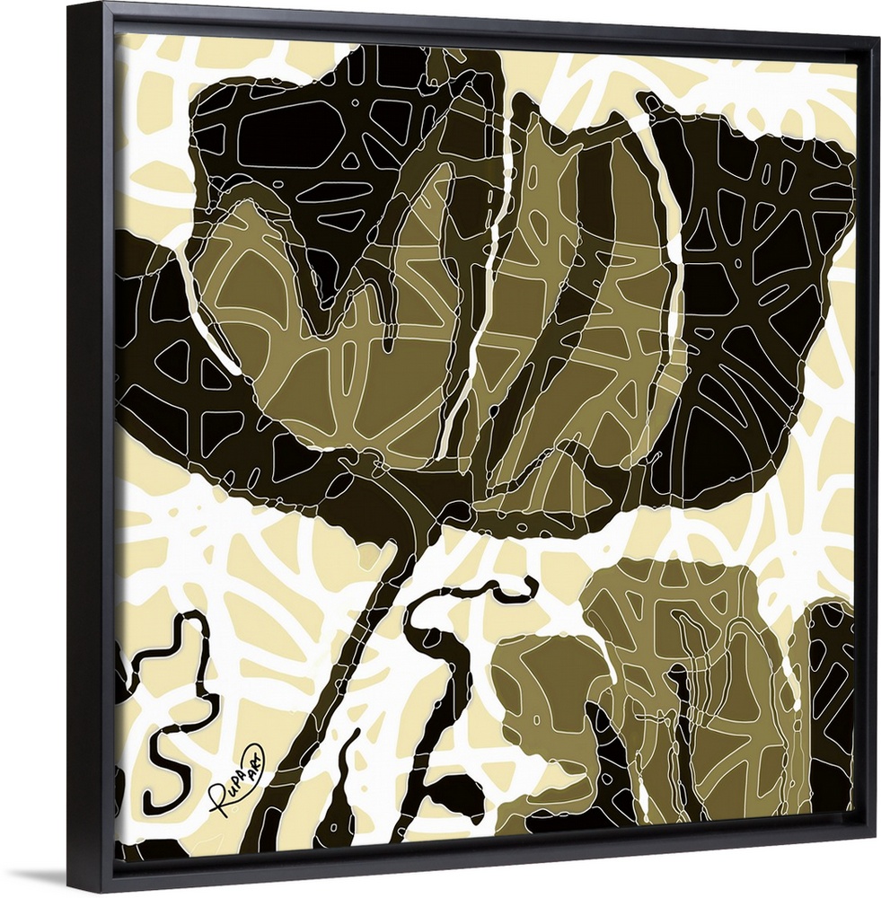 <p>Square abstract art of a large black and brown flower with white outlined designs on top.</p>