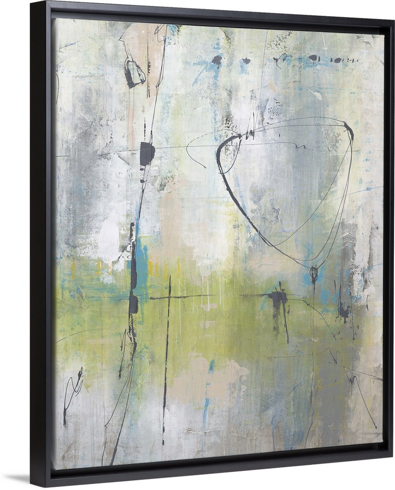 <p>Abstract art of many thin, dark lines in various forms and directions, on top of a background layered with several light tones that have been brushed vertically.</p>