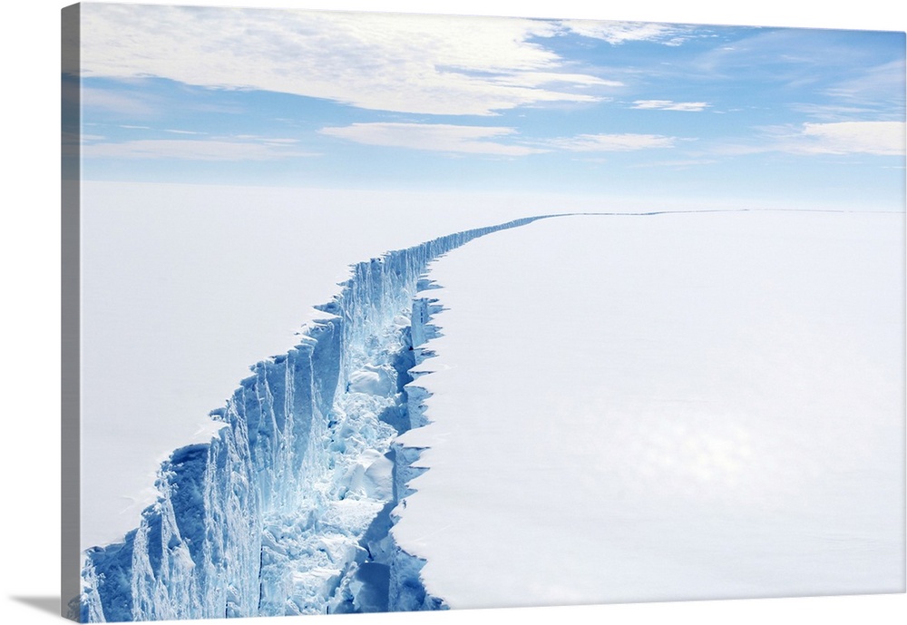 <p>Larsen C Ice Shelf rift, aerial photograph. The rift in Larsen C formed in mid-2016 and expanded until in July 2017 it lead to the breaking off of a large iceberg (known as A-68). The iceberg had an area of around 6,000 square kilometres, more than 10 percent of the area of the ice shelf. The Larsen Ice Shelf extends along the east coast of the Antarctic Peninsula, in the Weddell Sea.</p>