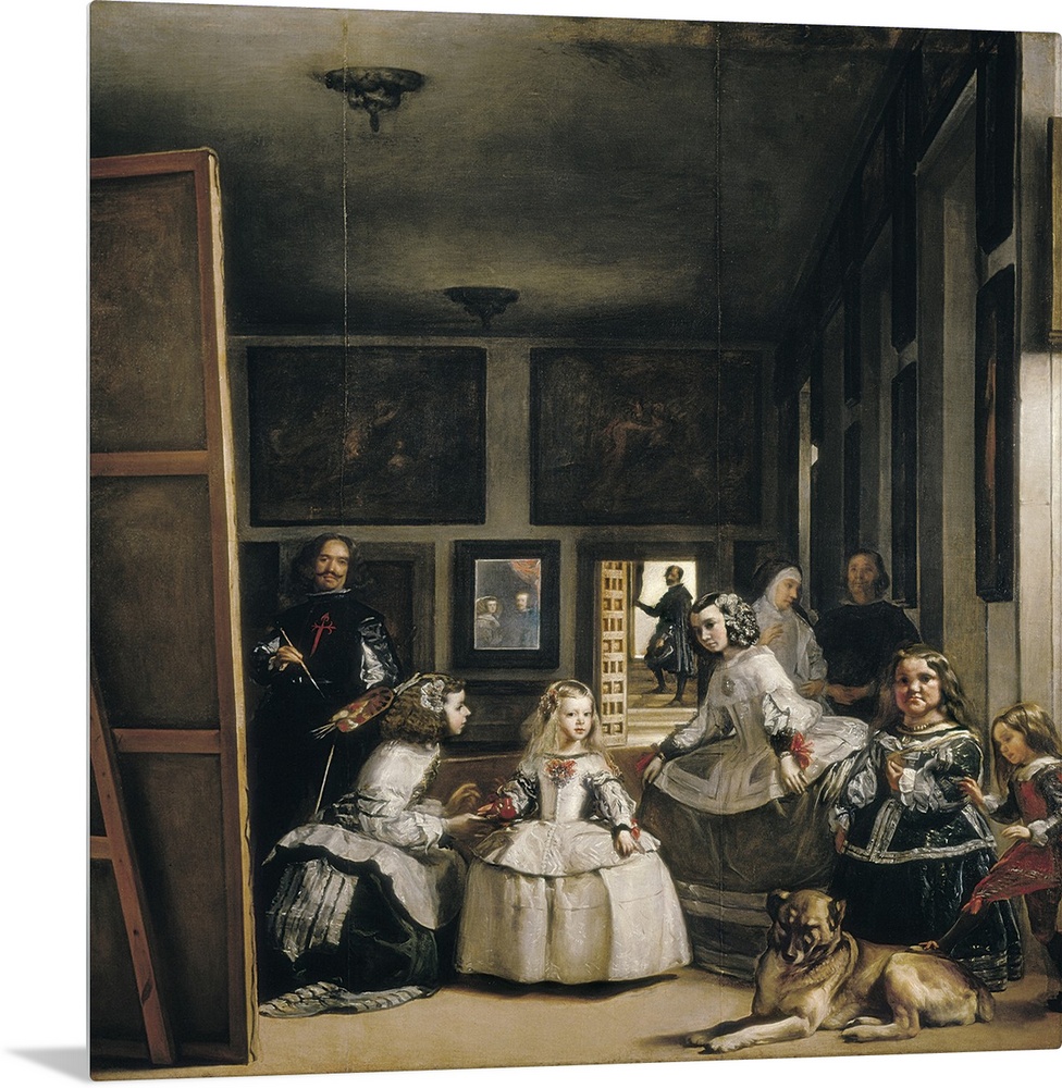 <p>VELAZQUEZ, Diego Rodriguez de Silva (1599-1660). Las Meninas (The Maids of Honour or The Family of Philip IV). 1656. The Infanta (princess) Margarita in the middle and, beside her, Isabel Velasco and Agustina Sarmiento. Together with her, the dwarfs Maria</p>