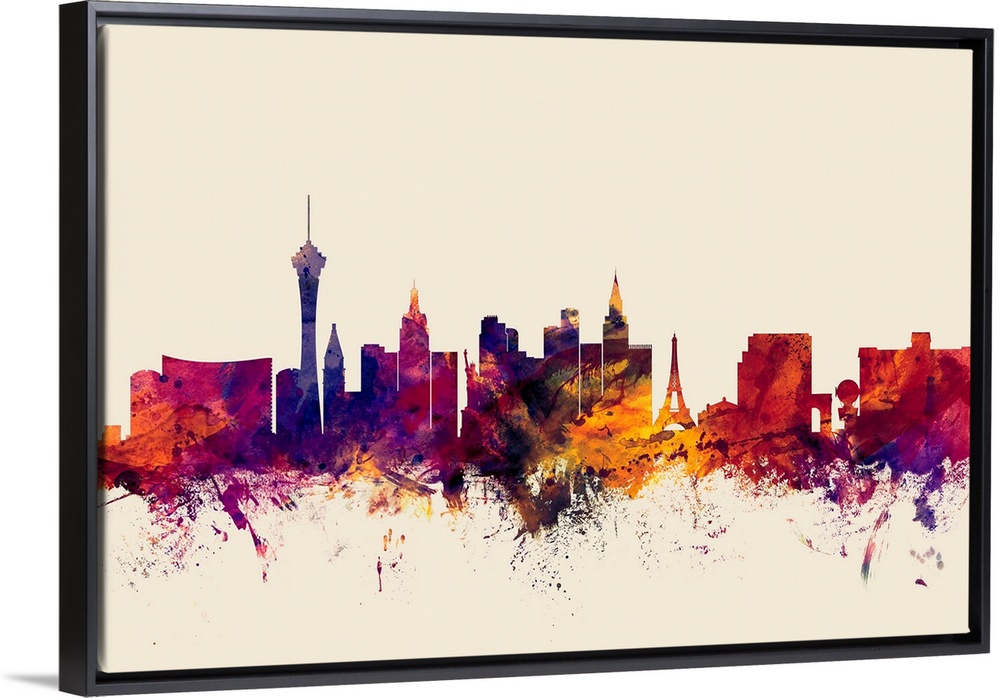 <p>Contemporary artwork of the Las Vegas city skyline in watercolor paint splashes.</p>