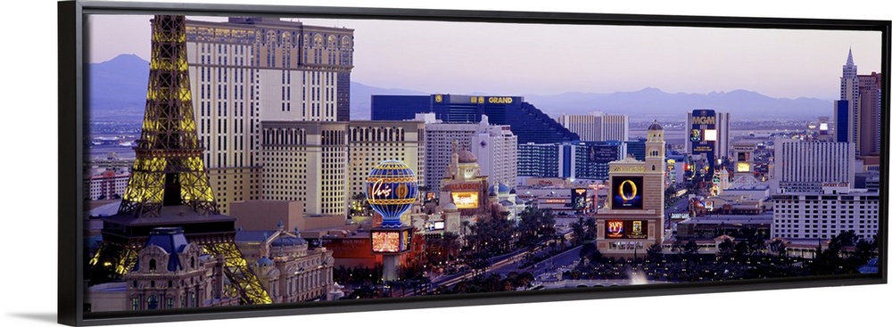 <p>Panoramic photograph of ""Sin City"" skyline with mountains in the distance. The buildings are lit up and the neon signs are glowing.</p>