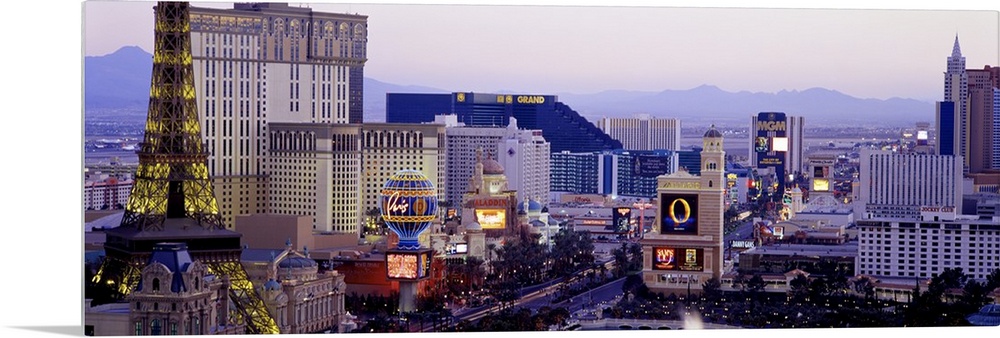 <p>Panoramic photograph of ""Sin City"" skyline with mountains in the distance. The buildings are lit up and the neon signs are glowing.</p>