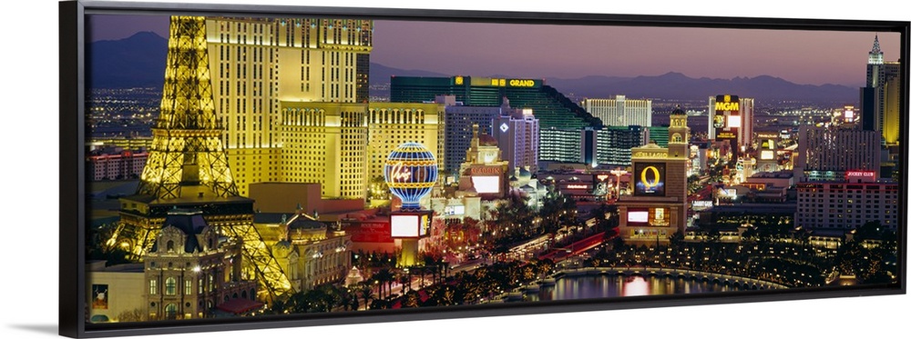 <p>Panoramic photograph taken of the Las Vegas skyline at night with the bright lights of the buildings shown.</p>