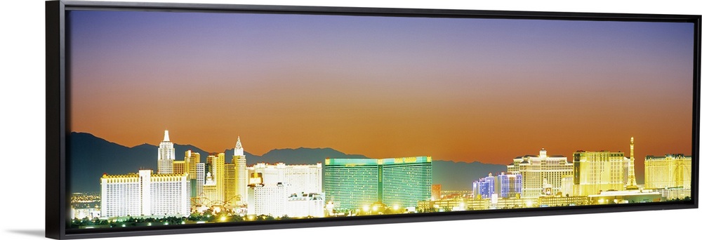 <p>Panoramic photograph taken from a distance focuses on a selection of brightly shining casinos, buildings, and streets within the nicknamed "Sin City" found within the Western United States. The glowing light of this popular city is contrasted by a desolate desert landscape in the background.</p>