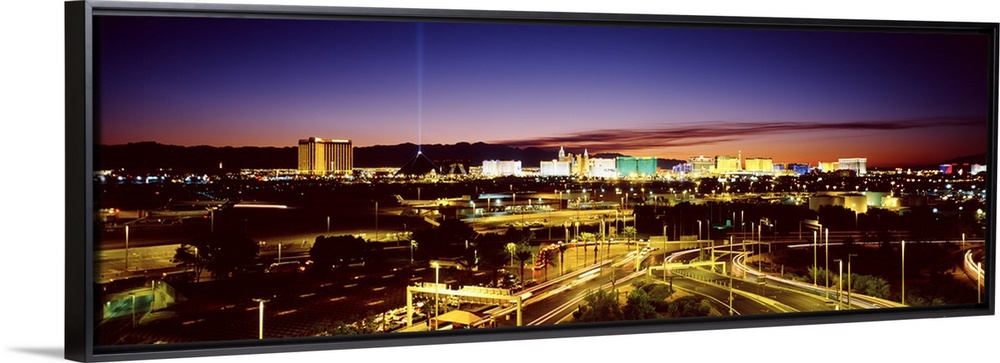 <p>Las Vegas buildings illuminated at sunset.</p>