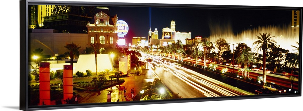 <p>Panoramic photograph of light trails from cars driving down the Las Vegas strip, bright lights shining around Paris and the fountains of the Bellagio.</p>