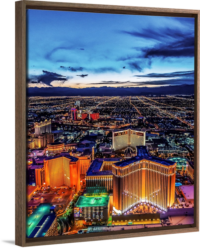 <p>Aerial view of the Las Vegas Strip illuminated in the early evening with cloudy skies.</p>