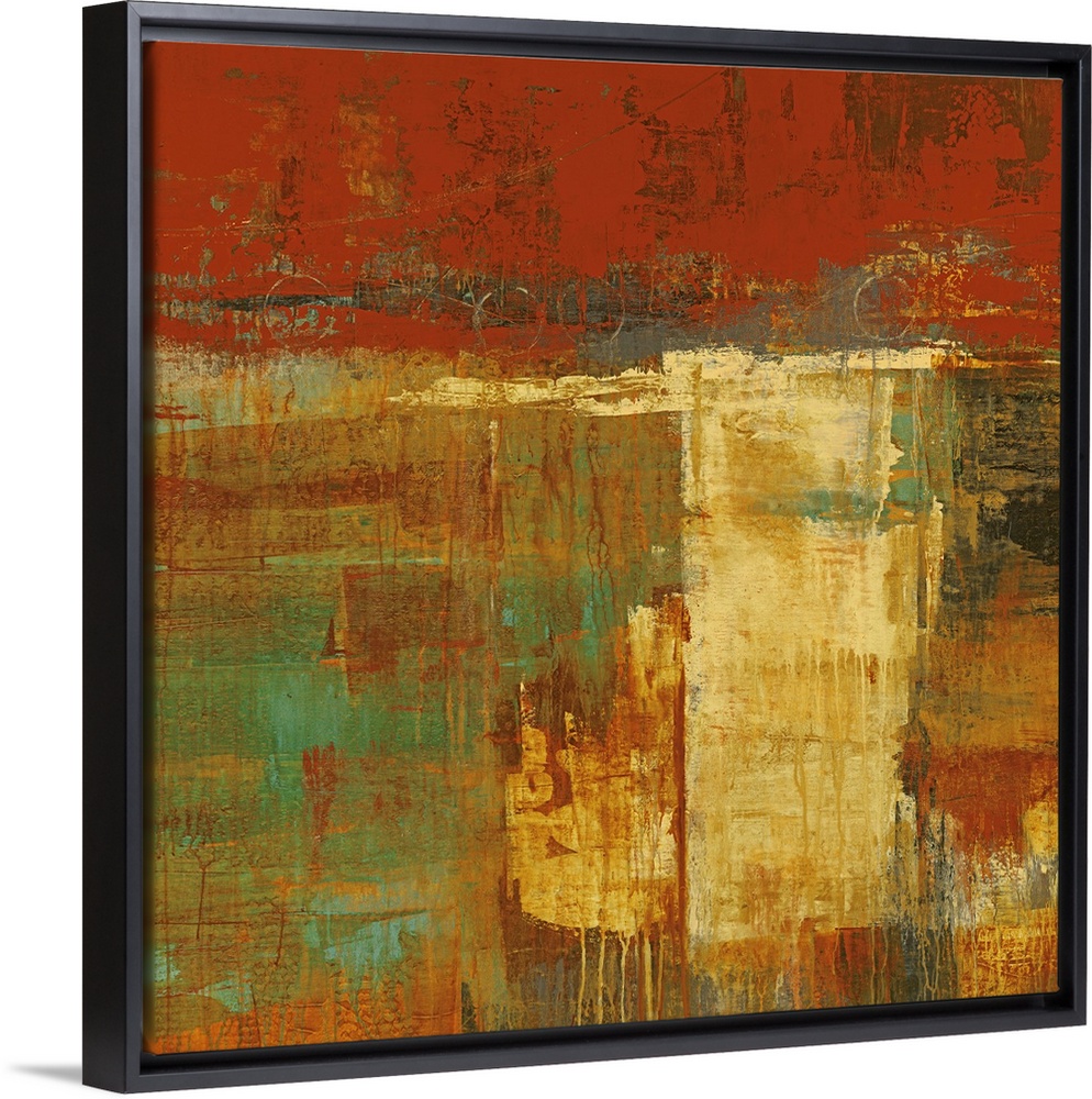 <p>Abstract artwork that uses lots of warmer tones and blocks of painting. Some of the paint has dripped down the print.</p>