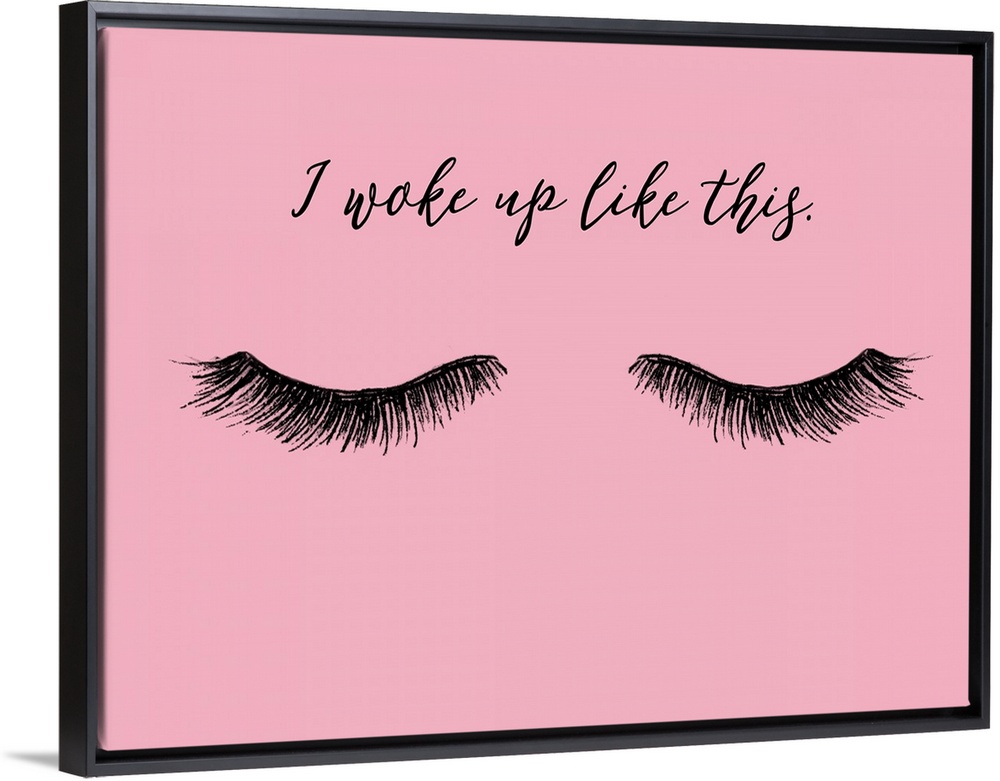<p>"I Woke Up Like This" with eyelashes in black on a pink background.</p>